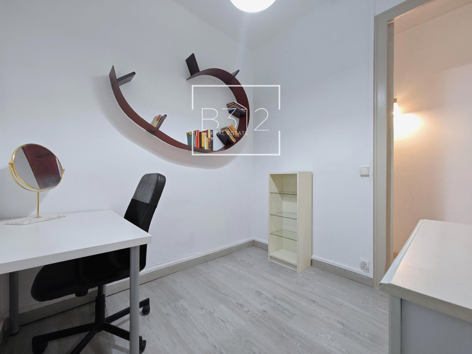 La vivienda dispone de una habitación individual, actualmente utilizada como zona de teletrabajo, ideal para quienes buscan flexibilidad en su día a día. A continuación, encontramos la cocina independiente y, seguidamente, una habitación principal amplia, de forma cuadrada, que permite aprovechar cada metro de forma eficiente.